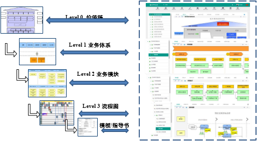 怎样做到流程体系可视化?根据流程建设的逻辑,首先要有一级架构,基于一级架构可以分层分级展开,到各个子模块,最终落实到具体的流程文件,如下图所示: