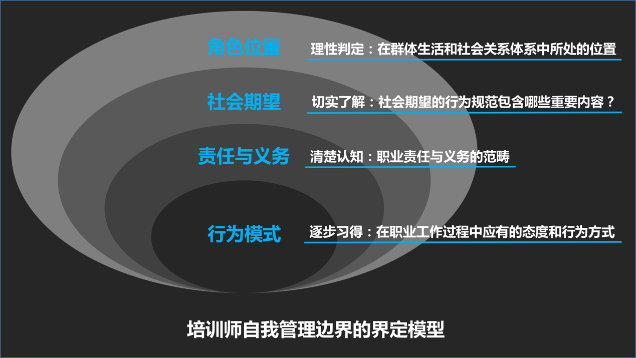 这两个维度的因素考量都有一个共同的指向,即职业职责。既然培训师的职业边界直接指向其职业职责,那么培训师的自我管理指向和依归,就应该是其职业职责。这形成了培训师自我管理边界的界定模型,如图1-1所示。