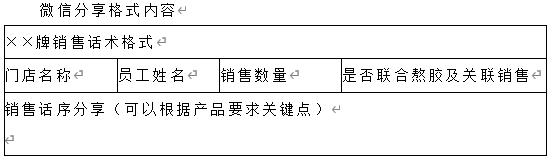 D.分享奖励:每日每个门店早上9:00前在群里分享一句话营销或关联销售话术,由培训部当天中午12:00前选出一家分享优秀并在群内做通报,奖励20元(培训部登记完成后交绩效薪酬部,工资提现)。
