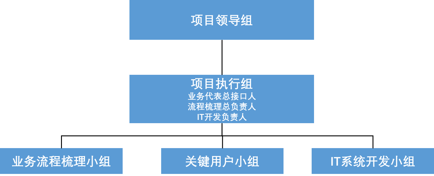 项目执行组:由业务领域接口人、流程梳理负责人、IT开发负责人担任,必要时还可以将组织、绩效模块的执行人纳入执行组,便于项目实施。执行组是项目团队的中坚力量,负责承接项目目标,拟定项目方案,推动项目实施,确保项目顺利完成目标。