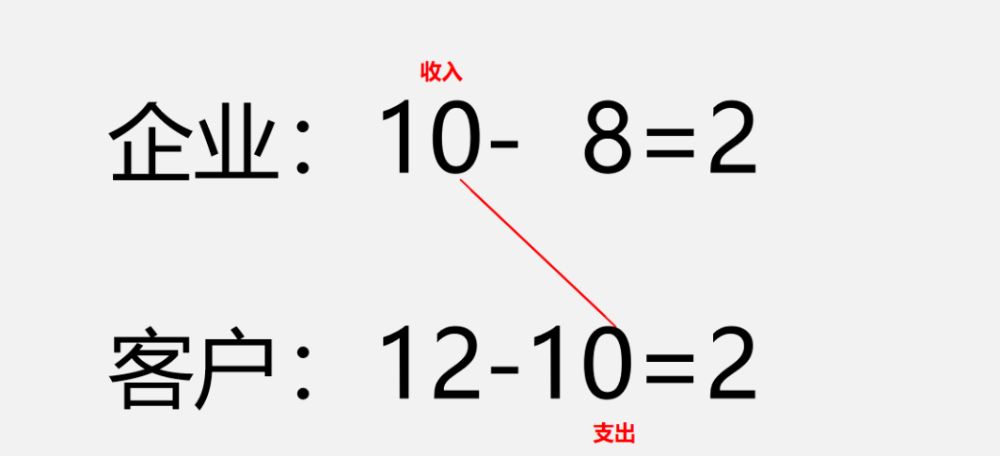 企业的等式10-8=2和客户衡等式12-10=2两个恒等式拆分后,我们会发现,客户支出的10块钱到了企业那里就变成了收入(如下图)。