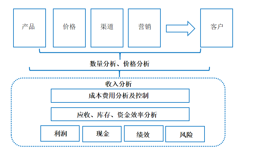 从财务人熟悉的角度往前去延伸。先从报表开始关注利润情况、关注资金情况、关注绩效结果、关注风险-往前延伸再关注应收、库存以及资金效率-再往前延伸关注成本费用和风险控制-再往前延伸把收入拆分为数量和价格-再顺着影响数量和价格的因素往前推-找到数量和价格的最受承载体是客户-再顺着影响客户的因素往前推到营销的4个关键因素,也叫营销4P上去(产品、价格、渠道和营销)。