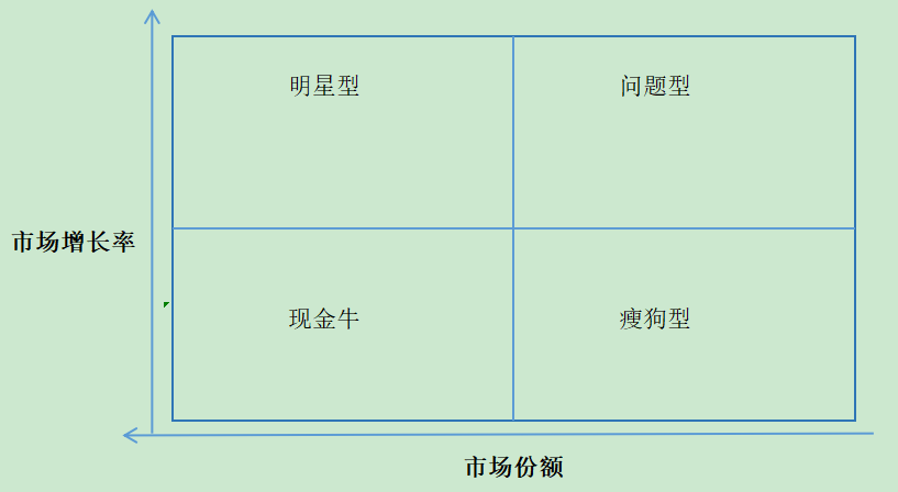 2、产品与价格策略:可以利用波士顿模型将产品按市场增长率与市场份额两个维度划分为四个象限,即四种大类产品。