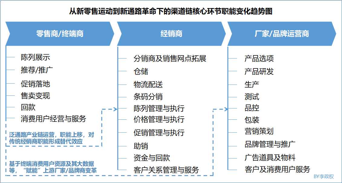 零售商们将会从传统的陈列展示、推荐/推广、促销落地、售卖变现等旧有职能,上攻上游的经销商职能,从而将仓储、配送、分销等加入自身的职能目录,同时借由线上、线下的融合,用户资源的数据化聚合,以及消费大数据等,强化渗透对上游厂家/品牌运营商的影响,“赋能”它们在产品研发、生产、品牌运营等方面的业务、管理及流程变革。