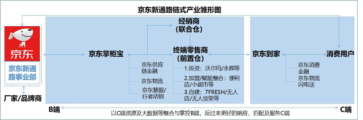 这些努力都有一个明确的指向,那就是吸纳、服务和经营好个人、家庭、企事业单位等泛零售用户。因为这才是京东大平台的根基,才是整个新通路产业链条的牛鼻子和龙头,并以此反哺新零售与新通路体系的建设。