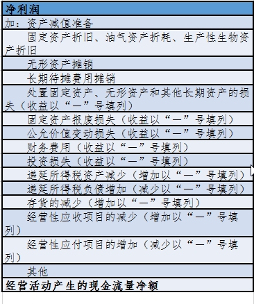 在此特别介绍一下将净利润调整为经营活动产生的现金流量净额的间接法。企业会计准则规定企业应当在附注中披露将净利润调节为经营活动现金流量的信息(其实还要求披露不涉及现金收支的重大投资和筹资活动,以及现金及现金等价物净额变动等信息,在此不展开)。