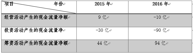 2016年,经营净流出10亿元、投资净流出90亿元、融资净流入94亿元。就是经营赚不到钱、完全靠融资来弥补亏损和加大投资,靠搏一搏,投资那边如果搏输了,企业就很危险了。