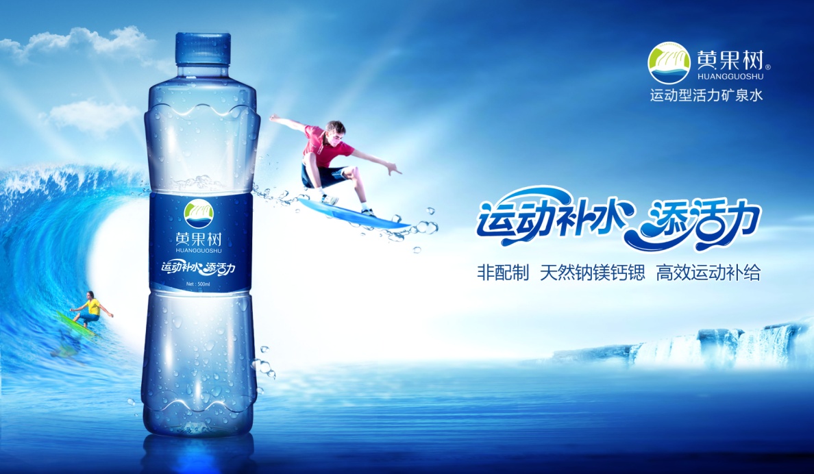 至此,以“运动型活力矿泉水”的定位为前提,以“健康、活力、年轻”为核心,我们明确了黄果树品牌的整个品牌架构体系的建设:针对“都市爱运动的年轻人”的目标群体,传递品牌自身的独特主张“运动补水添活力”,以将黄果树矿泉水打造成为具有“高品质、自然地、有风格的”高端矿泉水品牌。宣传广告如图6-6所示。