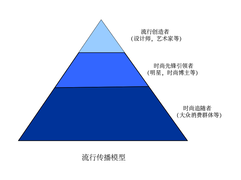 潮流由艺术家、创新者、设计师等创造出来后,被先锋时尚人士追随,这类人通常有敏锐的时尚嗅觉,热爱时尚,勇于尝新,如明星、时尚博主等。这些时尚先锋人士通过各种媒介影响周围的人,使得新潮流在大众消费者中广泛流行。这种流行模式是个别人创造,少数人引领,大多数人追随的模式,呈金字塔状,如图2-3所示。