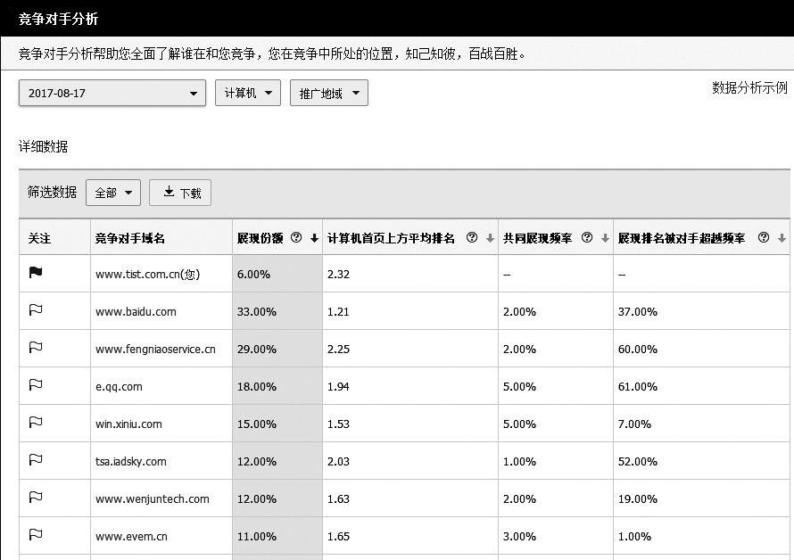 虽然你可以通过【推广实况】工具可以看到自己与竞争对手的广告,但【竞争对手分析】工具能够通过百度大数据向你透露一些对手的信息。反过来,这些信息竞争对手也能看到。如图3-59所示,这是我公司账户的【竞争对手分析】结果,竟然还有百度公司。与这些大公司相比,我的展现份额很低,只有6%,情有可原。在这份表格里,还能发现以前没有注意过的竞争对手,可以进入他们的网站好好学习。