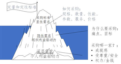 在需求冰山理论中:冰山的上部是显性需求,解决的是客户用什么标准采购;冰山以下的隐性需求,解决的是客户为什么要采购,是需求的触发点;而最深层次的需求是客户愿意采购哪一家的驱动力。