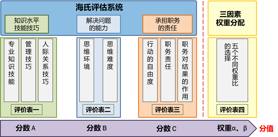 海氏评估实质上是一种评分法,认为所有职位包含的付酬因素可以抽象为三种具有普遍适用性的因素,即知能水平、解决问题能力和风险责任,通过三套评价量表,最后将所得分值加以综合,算出各个工作职位的相对价值。