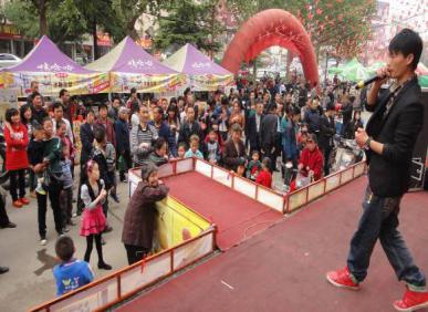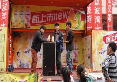 4至6月份,豫北市场充分利用两台舞台车广泛深入超市广场、乡镇集会庙会开展冰糖雪梨的一系列巡演活动68场,促销销量突破5000箱。现场结合K歌大赛、掰手腕大赛、畅饮大赛、互动演出、纳凉晚会等形式进行产品的宣传,如图3-9所示,短期内有效拉动了产品销售。