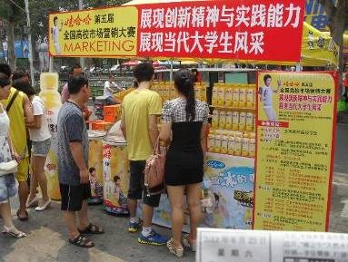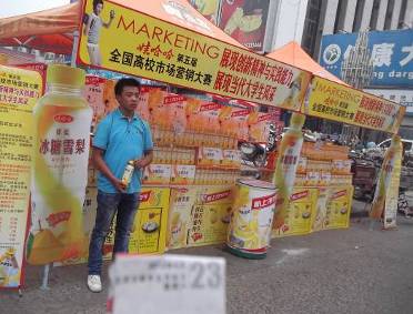 根据公司要求,豫北拓展队从6月份开始,已在紧锣密鼓的积极联系关于营销大赛的各项事宜。在这一阶段的营销大赛组织开展中,拓展产品仍以冰糖雪梨为主,延续4至6月冰糖雪梨的推广,在已初步打开冰糖雪梨销售局面的基础上,继续加强地面促销活动的跟进。在全省13个地区,发动400余名学生利用暑期开展实战营销的机会,为冰糖雪梨等产品的推广助力。通过实战前的培训,告知学生产品卖点、功效等信息,传授促销技巧及话术,为接下来的实战促销打下基础。考虑到6月末7月初正是学生考试放假的时期,因此,我们把握好时机,在6月份进入各大院校抓紧组织开展校内营销实战活动,7月份,则集中召集学生参加我们日常的周末旺点促销、社区、商超中小型促销活动,如图3-10所示。从6月中旬组织开展营销比赛至活动结束,通过校内校外实战促销共促成销量六千余箱,不仅广泛宣传了产品,也大大提升了此次营销大赛的社会关注度和参与度。