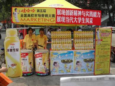 3月份,豫北市场首先确定新乡、焦作、洛阳作为冰糖雪梨推广的样板市场进行推广,这三个市场在3月份率先集中人力物力开始针对冰糖雪梨展开重点的铺市和推广,根据这三个市场先期的市场反馈,娃哈哈的冰糖雪梨在包装、口感等多方面较有优势,且市场铺市比较顺利,产品的消化周转期较快。因此,4月份,豫北市场开始组织全省进行全面推广,并对各区域下达了目标任务,每个区域也召开了全体经销商、业务员的动员大会,全省开始了声势浩大、步调一致的推广工作。