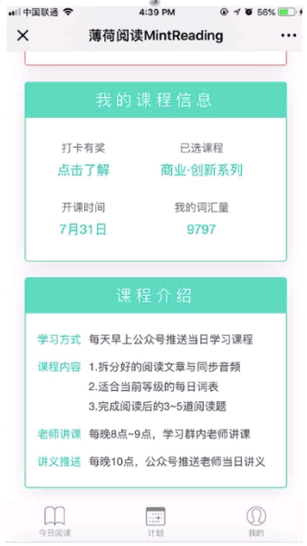 每天早上,推送当日的学习的课程,包括拆分好的阅读文章与同步音频,适合当前等级的每日词表,以及完成阅读后的3~5道阅读题。