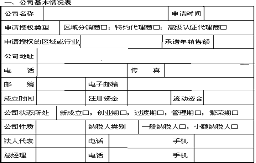 要求经销商提供相关书面材料(营业执照、财务报表等),注册资金有多少(可以部分说明其经济实力)、经营年限(企业的生命周期处于什么阶段)、企业法人(实际掌控人和法人是否是同一个人,避免风险)。还需要让经销商填写书面的材料。书面比口头正式,经销商提供的书面材料的准确度也更高。例如:对方口头说可以做1亿元,但是要写下来,他可能只同意5000万元。具体内容我们以华为网络产品代理商申请表为例(见华为Quidway系列网络产品代理商申请表):