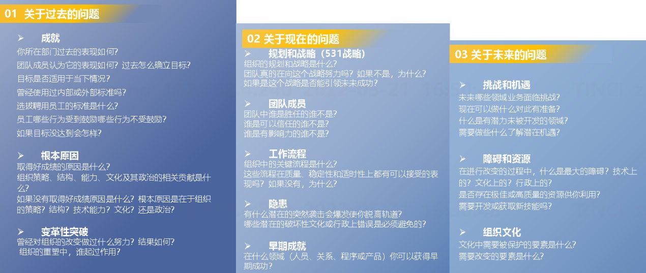 现在的信息包括组织的531规划、工作流程支撑、现有人员能力、现阶段组织面临的问题和最能突破的机会等。现在的信息的了解,有助于新任干部的行动计划与组织的目标要求和目标最有可能实现的途径保持一致性。