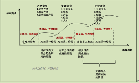 现在中国医药行业发展处于什么阶段?是产品竞争向企业竞争过渡的资源和能力竞争阶段,所以,国际药企通过各种方式获取中国的生产、研发和销售资源,而国内大型国有医药集团公司也都在通过并购、重组、剥离等手段整合资源提升能力。如果看清了这一点,那么就能理出适合医药企业自身的独特发展路径。