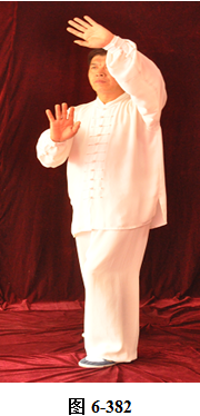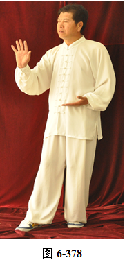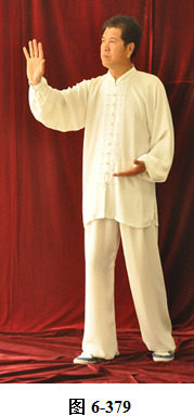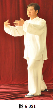 接上式,腰微拱,重心后移落在右腿上,呈后倚。左臂屈肘回收至左肋旁,掌心翻转朝上。身体向右转面向西南,随之腰向后里转,重心移落左腿上;右腰微上提,右腿提膝向前迈步,同时右勾手变掌向西南推出,掌心向外,高略与肩平,变右弓步;腰微后拱,重心落至左腿。右臂回收里旋,掌心翻转向里。左手经胸前向右上划弧掤,掌心翻转向里,两臂弧形,掌指相对,向外撑圆。腰上提, 左膝微提,左脚向左前迈步;腰微拱,重心后移至右腿,腰上提, 身体微前移,弓左膝。左手臂向左外翻转上升举过头顶,手腕翻旋, 掌心向外架于左额前上方。右掌由胸前外翻旋,向西南推出,眼神向前平视(见图6-378至6-382)。