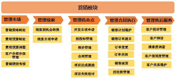 对业务模块进行分析后,再对实际业务进行分析,如销售与后端交付过于笼统,需要进一步拆分。根据销售项目的先后顺序分解为销售线索、销售机会、销售合同三个环节,这样就形成了大致的业务架构规划。如图2-1所示。