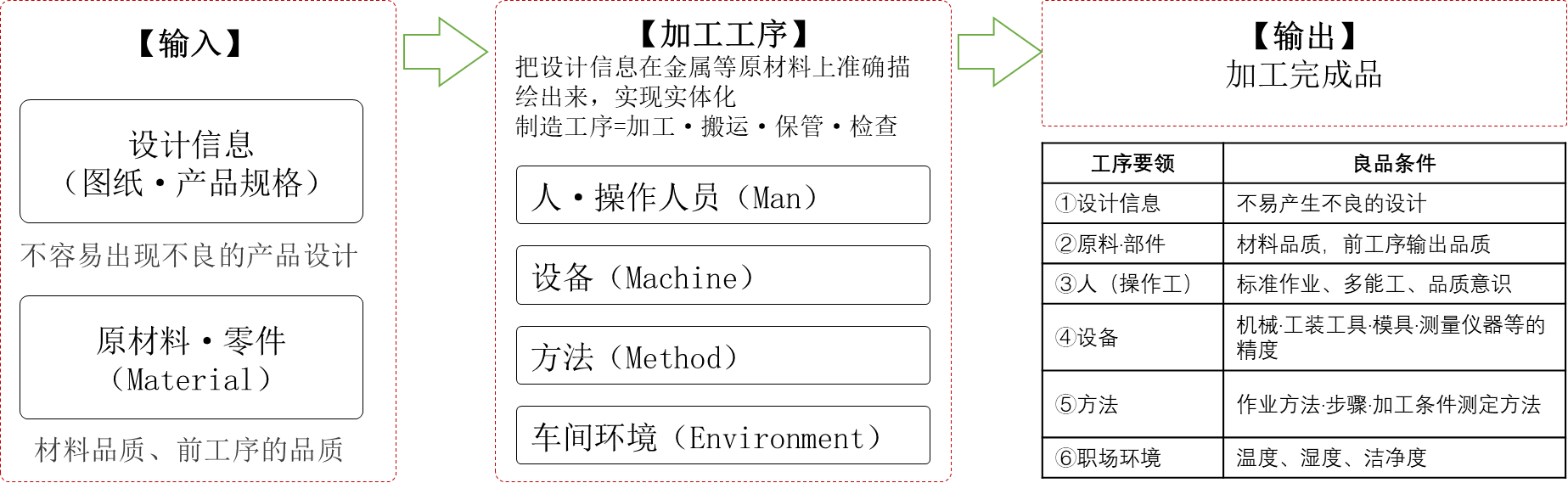 要实现在工序内造就品质,就要确保良品条件,由重视检查(结果)的做法转向重视过程和原因的做法。在工序内造就品质的相关工序中,只有加工各工序使原材料发生一系列类变化,成为产品,提升附加价值,搬运、保管、检查等各工序也并不是与品质无关,要承担不使品质恶化的义务。