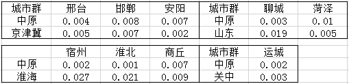 中原城市群与4个城市群有势力范围的交叉重合。邢台、邯郸和安阳3个城市同时纳入中原城市群与京津冀城市群势力范围,将3个城市分别与2个城市群的经济联系强度进行对比分析,邯郸和安阳则更倾向于融入中原城市群,邢台更倾向于融入京津冀城市群。