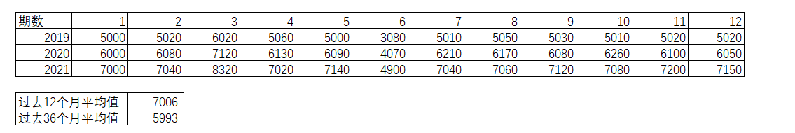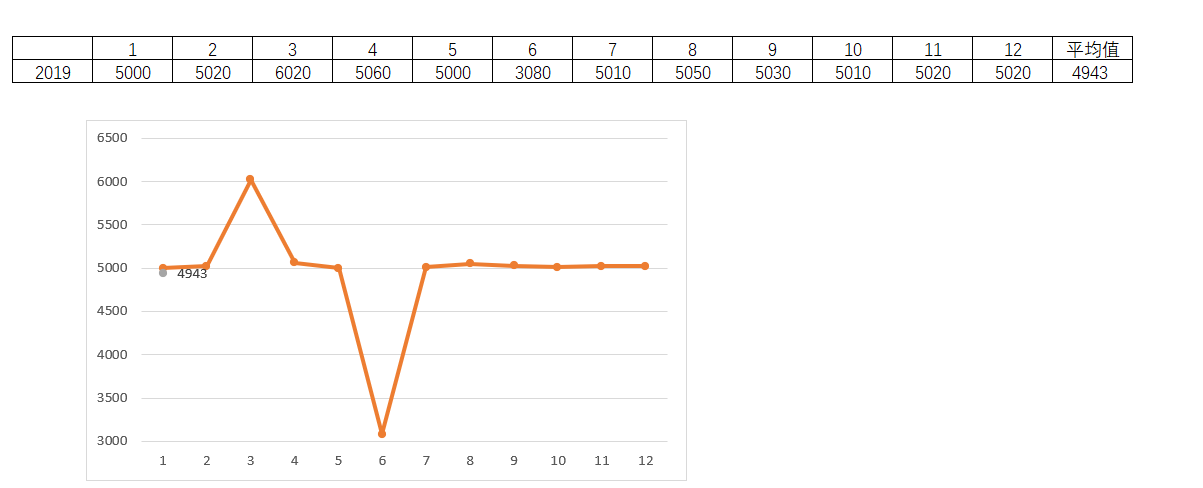 比如利用2019年全年的月需求数据,通过计算每月的平均值,并把2019年的月平均值作为2020年1月的预测值。如图4-6,平均值4939就是作为下一期,即2020年1月的预测值。