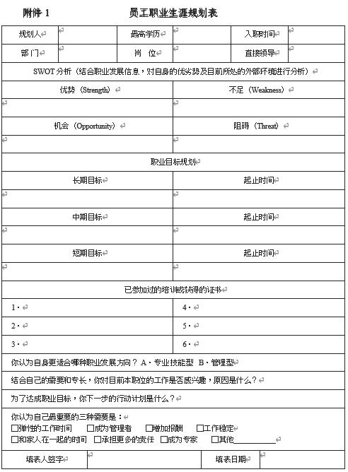 五、管理规定 1.职业生涯规划的组织管理 (1) 员工的直接上级,即主管领导为员工的职业发展辅导人,如果员工转换部门或工作岗位,则新的主管领导为辅导人。 (2) 员工在入职时(最迟在转正时),人力资源部应同员工的主管领导一起为员工建立职业发展档案,其中包括“员工职业生涯规划表”“员工能力开发需求表”,职业发展档案一式两份,员工本人一份,其主管领导一份。 (3) 人力资源部每年制订培训计划及科目时,应从员工需求的角度出发,参考员工“能力开发需求表”确定相关培训内容,具体按企业的“培训管理制度”执行。 (4) 人力资源部每半年需与员工职业发展辅导人共同对员工职业发展档案进行一次检查评估。借此了解企业在过去半年中有没有为员工提供学习培训与晋升机会。同时,掌握员工半年内的考核情况及晋升情况,并据此提出员工下阶段的发展建议,指导员工对职业发展规划做出修正。 (5) 员工职业发展辅导人每年在本年度工作结束、考核结果确定后,必须与被辅导员工就个人工作表现与未来发展进行谈话。在谈话中肯定员工的成绩和进步,指出其存在的问题,进而确定下一步的职业发展目标与方向。 (6) 人力资源部根据员工个人发展的不同阶段及岗位变更情况,选定不同的发展策略并调整岗位需求,以使其适应岗位工作及未来发展的需要。 2.员工个人职业生涯规划 员工个人职业生涯规划流程:自我评价→现实审查→目标设定→行动规划。在个人职业生涯规划过程中,职业讨论并未暗含承诺或担保,员工的发展 直接取决于企业的需要和机会,以及员工自己的业务技能水平。 (1)自我评价。主要采取如下两种方式:①心理测验,帮助员工确定自己的职业和工作兴趣;②自我评估练习,帮助员工确认自己喜欢在哪一种类型的环境下工作。 |