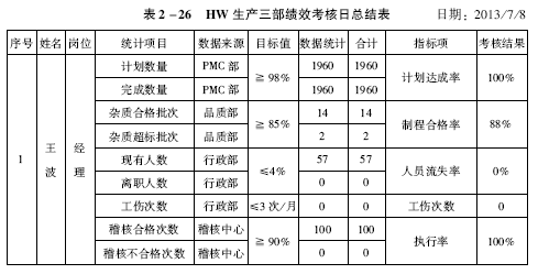 :为了引起员工的重视,项目组就制订日统计表,每天在生产协调会上汇报,公布考核的结果。生产三部7月8日份绩效考核日总结如表2-26所示。