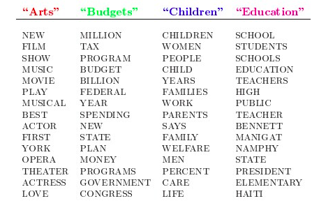 人类是怎么写作的呢?LDA的这三位作者在原始论文中给了一个简单的例子。例如,假设事先给定了这几个主题:Arts、Budgets、Children、Education,然后通过学习训练,获取每个主题Topic对应的词语。如图5–3所示。