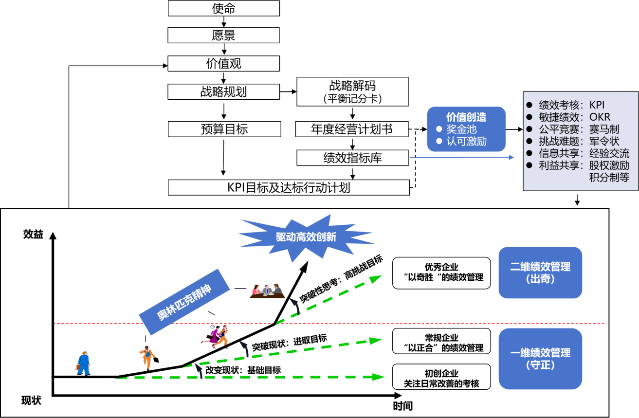 “不谋全局者,不足以谋一域”。绩效管理是一个比较复杂的系统,要做好绩效管理体系如同建造一幢房子,首先是要设计好房子的“框架”,其次才是规划好房屋的建筑结构,根据梁、柱、墙等主要承重构件的建筑材料分门别类进行设计规划,根据“框架”的情况,按计划完成施工与装修。“大道至简”,为了向大家讲清楚绩效管理体系的运行轨道,绘制了二维绩效管理模式运作架构,作为了解绩效管理全貌的导航路径。