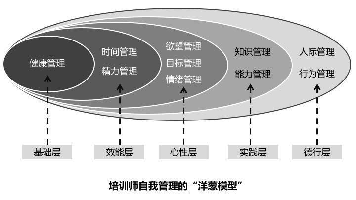 从上图所示的“洋葱模型”可以看出,培训师的自我管理包含五个层级,共计十个方面。