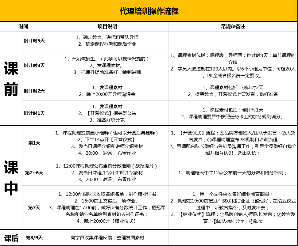 ⑶开课仪式会。由助教辅助微商团队长对所有听课的代理商开展动员大会,主要是塑造课程的落地性和实操性,提升团队形象,向听课学员介绍课程流程、PK机制并收取PK金。
