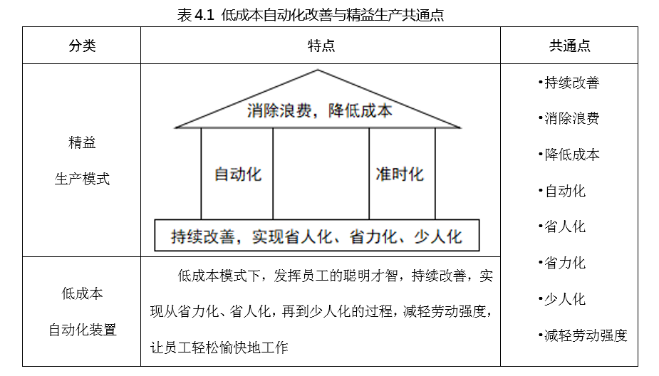 低成本自动化源于丰田精益生产方式中的 “自动化” 支柱。精益生产的核心是通过消除浪费降低成本(而非偷工减料或取消工序),其体系以 “自动化” 和 “准时化” 为两大支柱。低成本自动化装置的定义是:通过现场改善,设计符合人体工学的工具,减少作业人员体力消耗和时间浪费,逐步实现省力、省人乃至无人化运作。