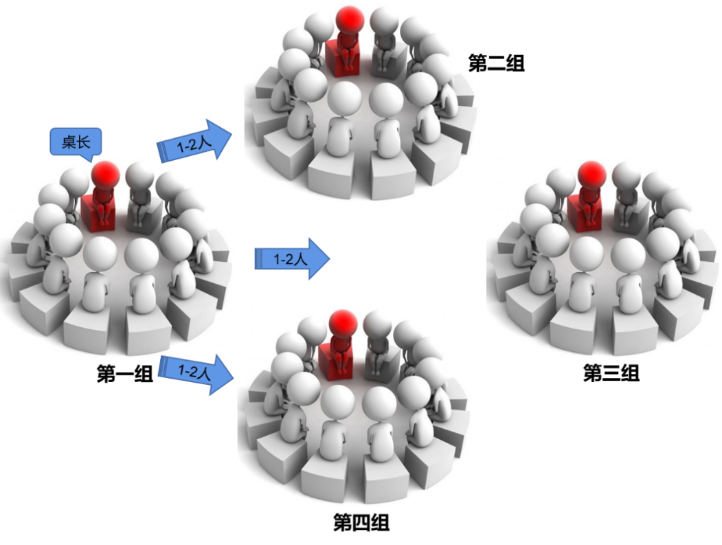 第四步,在新的讨论组中,每个人都要自我介绍,桌长要简单介绍刚才讨论的问题及想法,并鼓励新来的成员与之前讨论的内容联系起来。