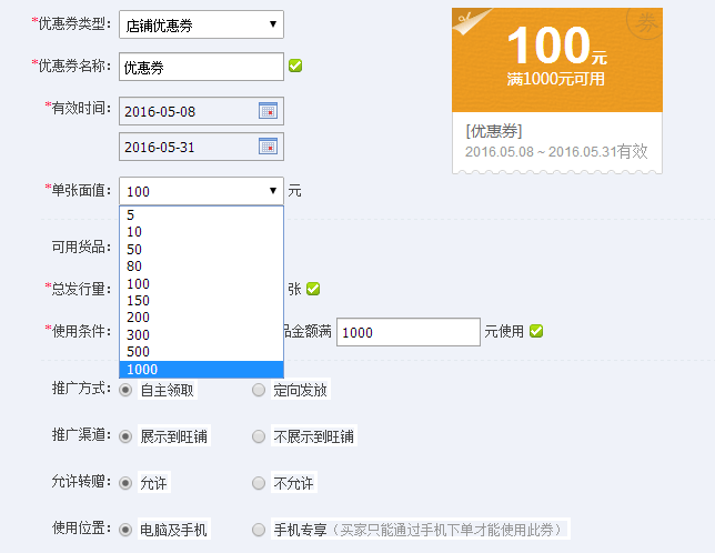 先创建好优惠券名称,然后是有效时间、单张面值(有10个档,自己按照自己设定满的金额和以及发行数量来定你那个档自己按照自己设定满的金额,以及发行数量来定你那个档)、发行量、金额满多少使用等。这些设置完了之后就可以点击下面的“创建优惠券”,然后完成优惠券设置。