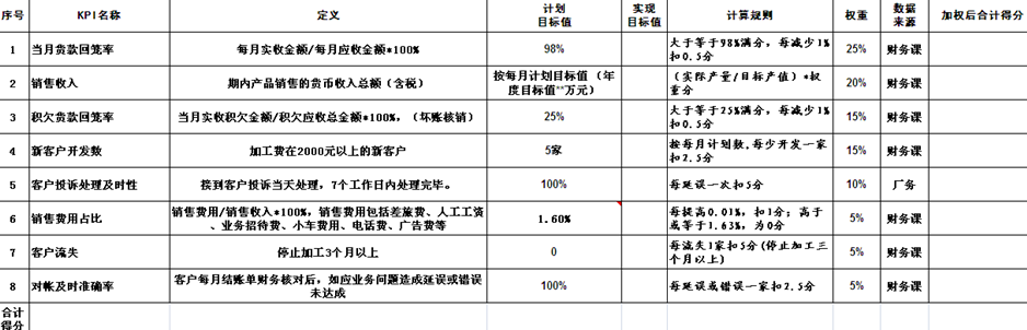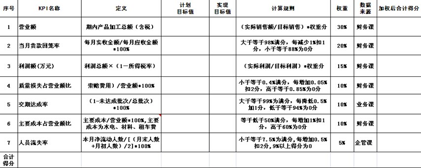 (1)绩效合同示例,有的绩效合同可以只用一张考核表囊括所有指标,具体如表9-6、表9-7、表9-8和表9-9所示。