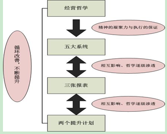 从员工自主经营管理“1532”模型整体来看,经营哲学处于模型的最顶端,起到基础和导向的作用。一方面,经营哲学逐级深入到模型的每一个部分,从而提供了精神的指引和执行的保证。另一方面,在模型的体系中,各个部分持续地相互作用,在这种循环中,每个模块得到自我修正,促进组织和个人得到提升。如图4-2所示。