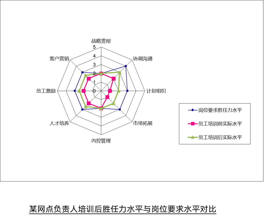 图11-3直观地说明,某网点负责人经过系统、科学的培训后,培训后比培训前的胜任力水平全面提升了一大步,更靠近岗位要求的胜任力水平。所以,以上的雷达图对比分析图也是在培训中展现培训效果比较常见的方式。