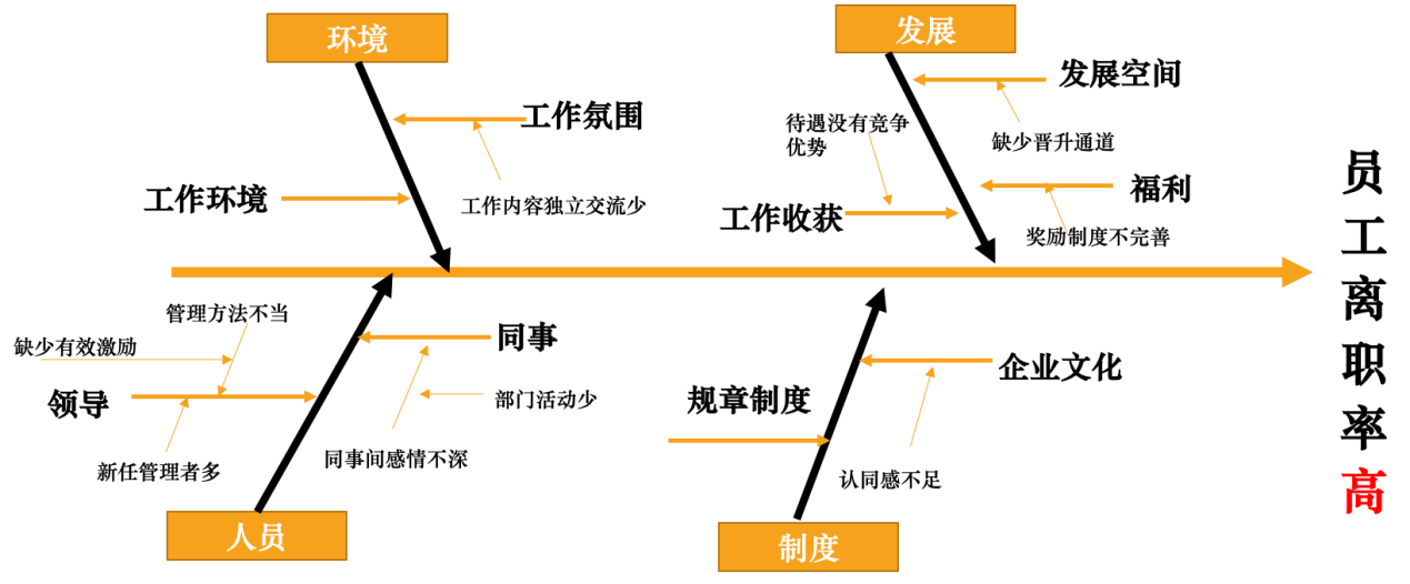 第二、鱼刺分支:从人员的角度谈离职率,一定是领导和同事的影响,多数是新任领导者对管理的角色认知不够,无法有效的赋能下属,没有合适的管理方法,缺少有效的激励导致下属与直接领导的冲突不和,这样就很难形成团队文化,导致离职,而同事之间没有好的活动进行情感链接也是原因之一。总之,从鱼刺可以挖掘进去很深。