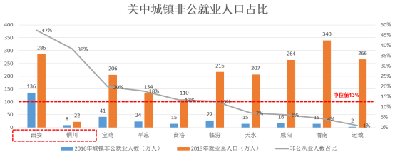 非公就业人口占比体现城市经济的活力和可持续性。关中城市非公就业人口占比中位值为13%,高于20%的城市非公就业人口活力较强,除天水、咸阳、渭南、运城外,均高于20%。