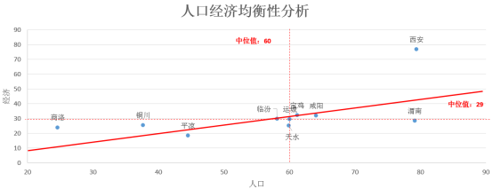 关中城市群人口与经济沿均衡线发展,均衡线以下且偏离越大的城市更应该关注产业发展,其中天水、渭南等城市要重点关注新产业进驻,有可能会带来城市发展的巨变;均衡线以上且偏离越大的城市更应该关注人口政策,其中西安等城市要重点关注人口政策变化带来的人口集聚,有可能会带来人口短时膨胀。