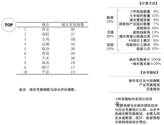 关中城市群城市基本面综合排名TOP3的城市为:西安、渭南、咸阳。处在城市发展较好区、适中区、较差区的城市个数比为3:4:3。