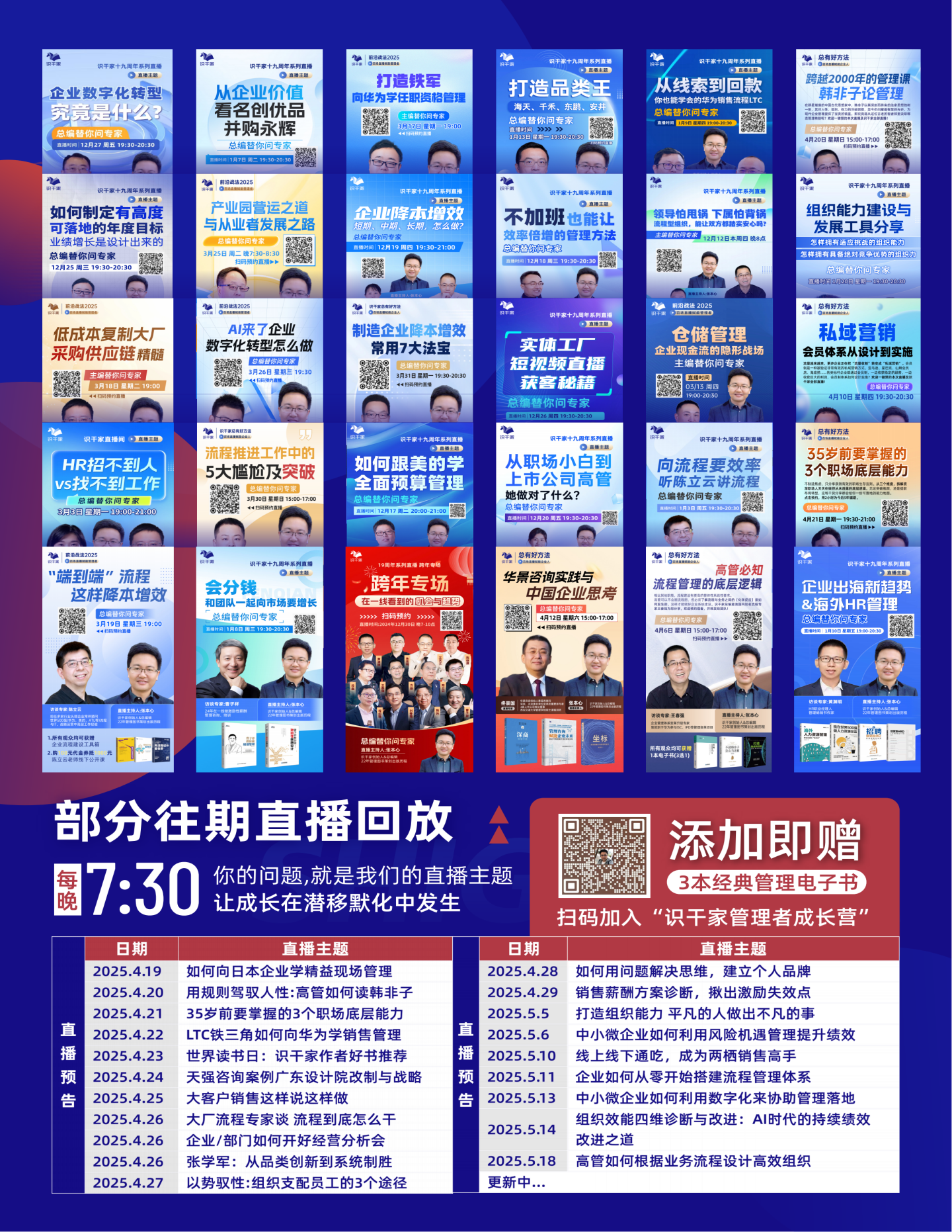 在企业管理领域,精益 5S 管理是提升效率、降低成本的重要方法。本次直播,《300 张现场图看懂精益 5S 管理》的作者乐涛老师,为大家深入讲解精益 5S 管理的内涵、应用案例,以及分享金能国际的全球商务考察项目,助力企业管理者开拓视野、提升管理水平。