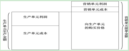 在分配方式A中,营销一线依靠生产一线支付的佣金而运转,实际上起到了生产一线和外部市场的“中介”作用。生产单元包括生产单元的成本、生产单元利润和营销单元的佣金,而营销单元按照生产单元金额的一定比例提取佣金,佣金包括营销单元成本和营销单元利润。如图6-2所示。