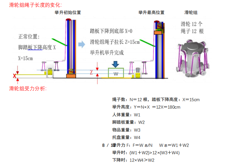 当人站在踏板上时,踏板会向下移动 15 厘米,随着踏板下压,滑轮组的结构发生变化,原本松弛的状态被打破,滑轮组开始运作,将放置在托盘上的料箱举起一定高度(设为 y)。关于 y 的距离计算方式,下图有详细分析说明。当重物压下使踏板触地,即 x = 0 时,滑轮组通过巧妙的力学传递,完成料箱的举升过程,极大减轻了人力搬运的负担 。