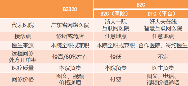 如图5-1所示,根据服务模式的不同,对应的接诊点、医生来源、处方开单率、医疗质量、问诊价格等都有所差异。相对比较来看,如表5-1所示,B2B2C模式更被行业看好及居民信任。