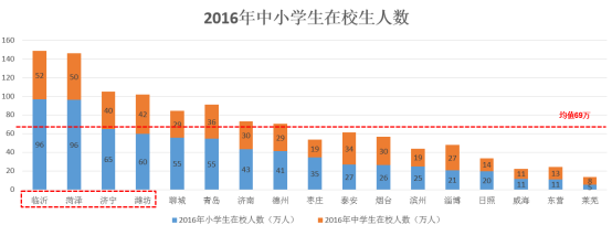 从小学生2016年在校生人数看,山东半岛城市群2016年小学生在校人数为691万人,占全国小学生在校人数9913万人的6.97%。相对山东半岛城市群占全国总人口比重7.2%,人口结构相对合理;山东半岛城市群17个城市小学生在校生人数五年总涨幅为7%;小学生人数较多且增幅较高的城市有7个,分别是:临沂、菏泽、济宁、聊城、青岛、潍坊、济南。