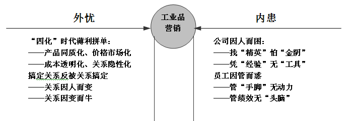 我国工业企业营销的外忧主要来自两个方面:一个是市场趋势,即“四化”时代薄利拼单;另一个是销售惯性,即搞定关系反被关系搞定。